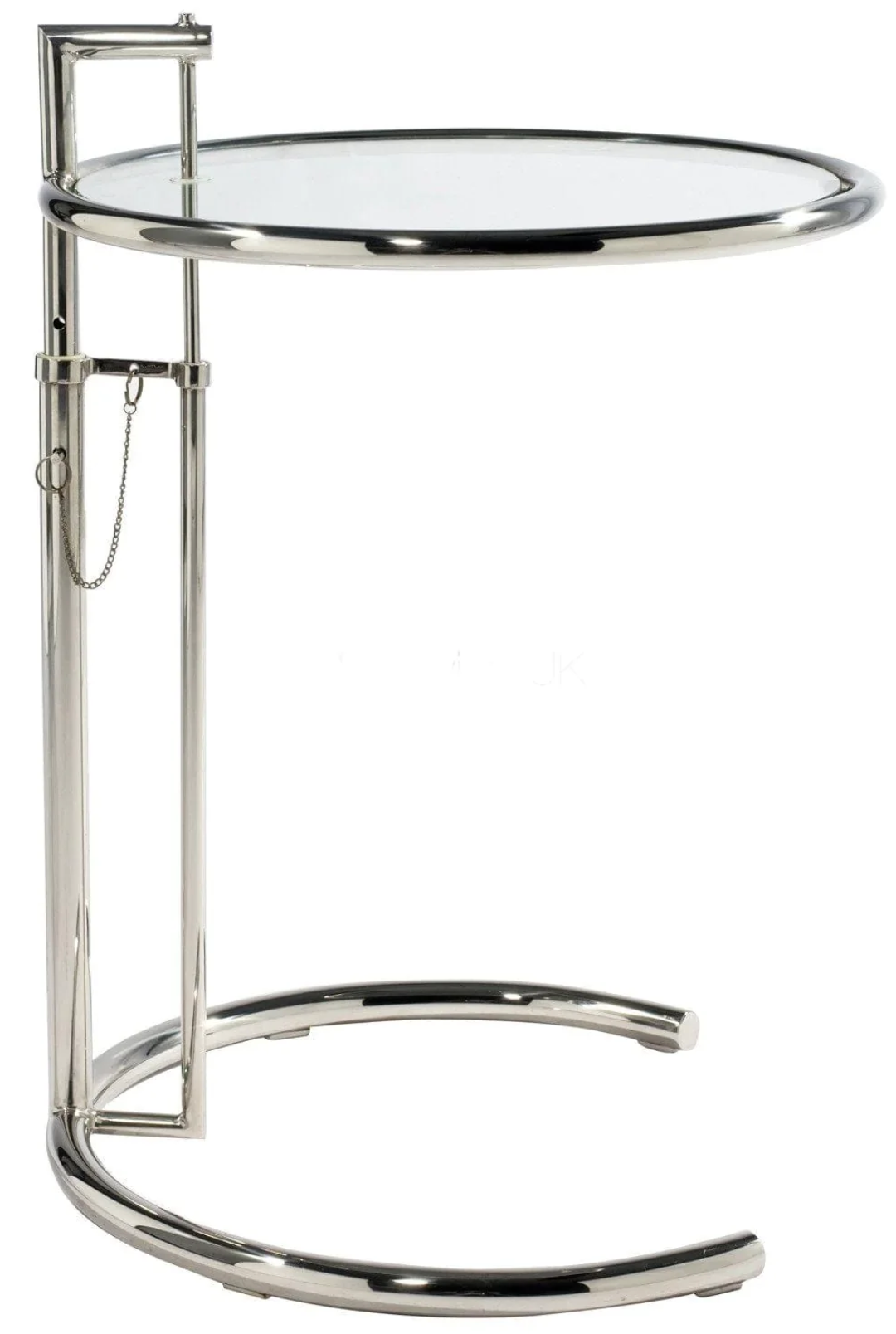 Its height is adjustable from 55 cm upwards, allowing it to fit seamlessly alongside sofas, armchairs, or beds. The minimalist chrome and glass design complements modern interiors, while the compact diameter of 40 cm makes it ideal for smaller spaces.