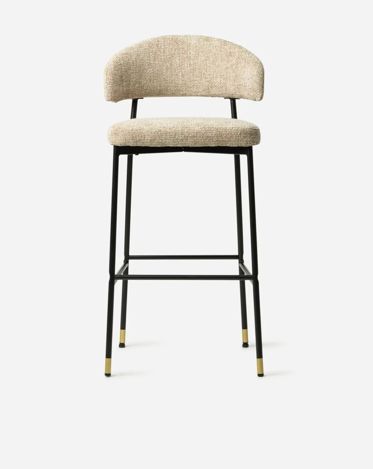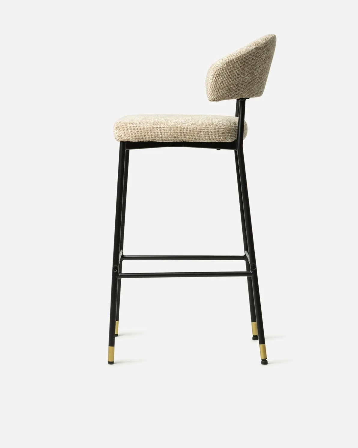 Elevate your seating with the Gaby Barstool, designed for modern interiors with a touch of glamour. The seat and backrest are upholstered in soft, textured 100% polyester fabric, providing lasting comfort, while the slim black powder-coated metal legs with brass tips add sophistication and durability.