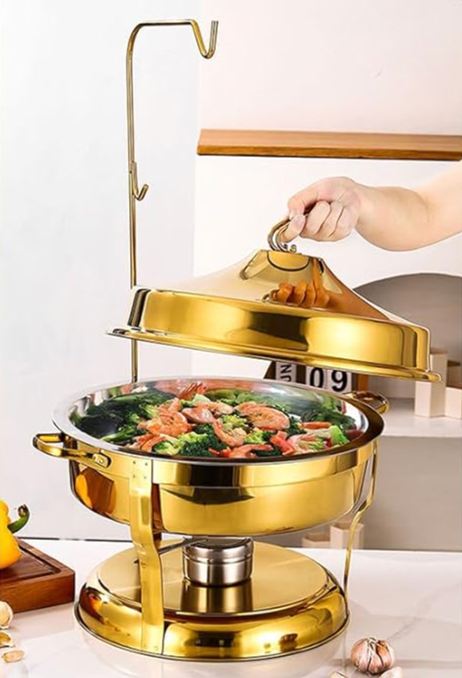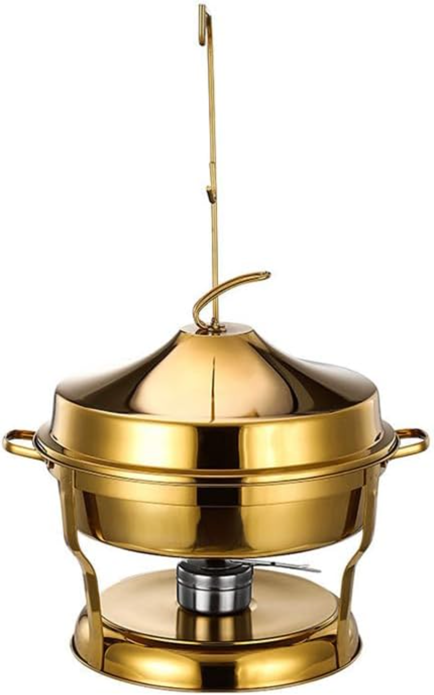 The 9L Round Stainless Steel Chafing Dish with Gold Cover is designed to combine functionality with luxury for any buffet or catering setup. With a generous 9-liter capacity, it is perfect for serving large portions of soups, stews, rice, pasta, or any hot buffet-style dishes.