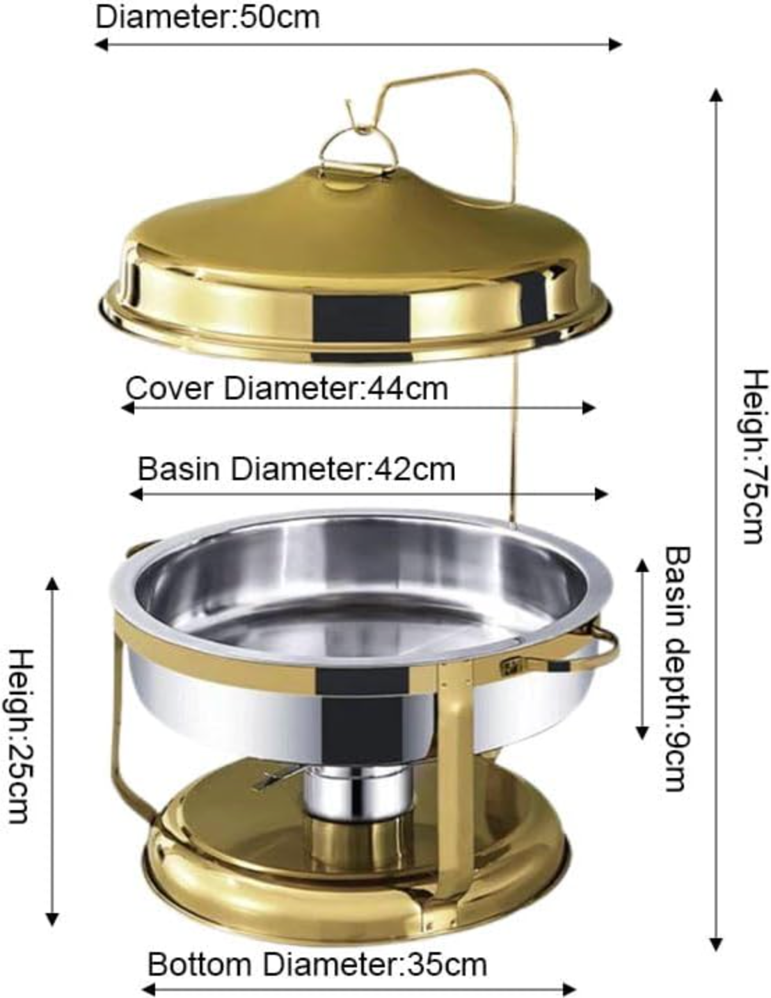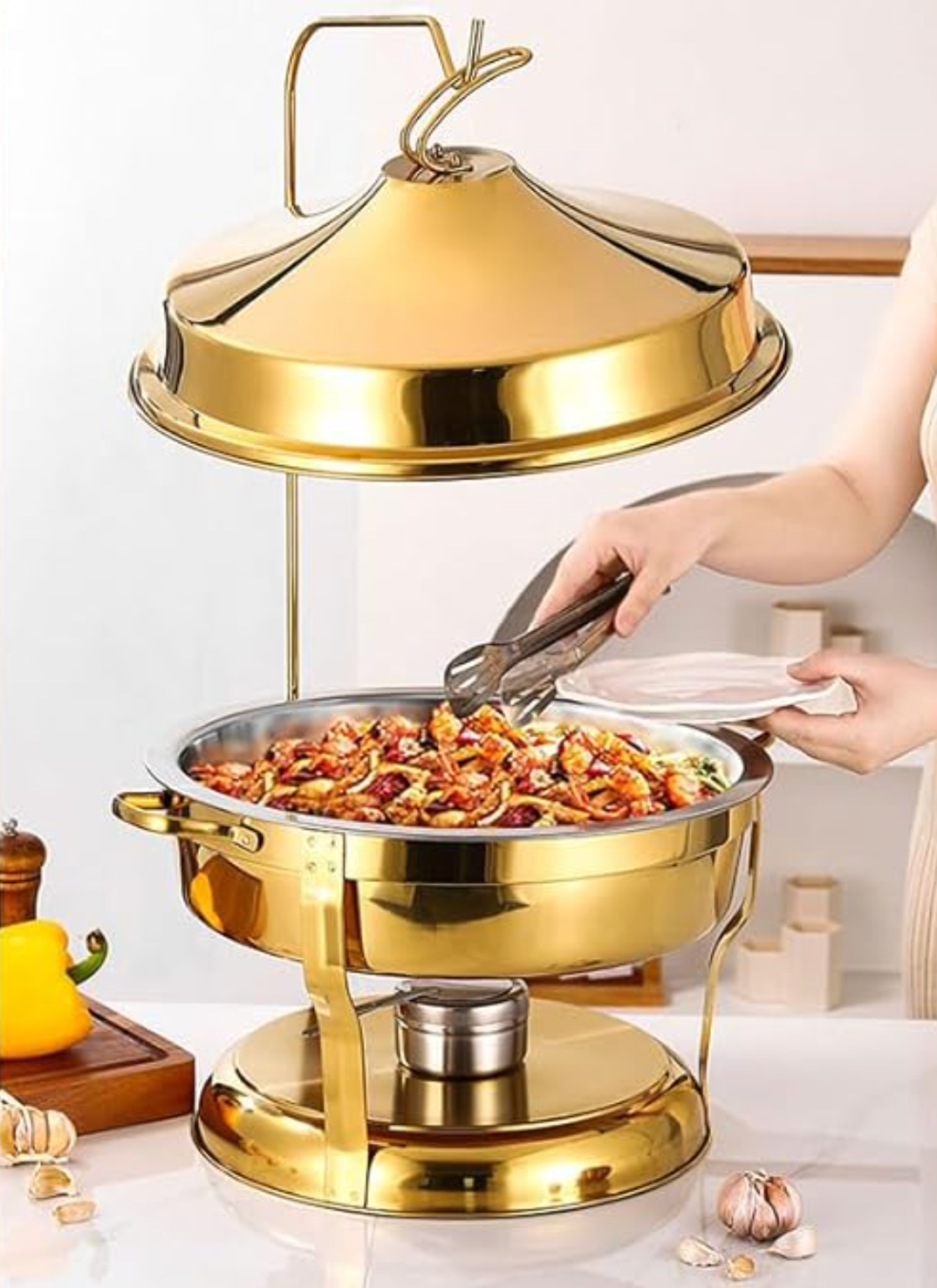 The elegant golden lid adds a sophisticated touch, making your food presentation visually striking and ideal for weddings, corporate events, and formal gatherings. Its classic round design ensures practical and stylish food display, while the high-quality stainless steel construction guarantees long-lasting durability.